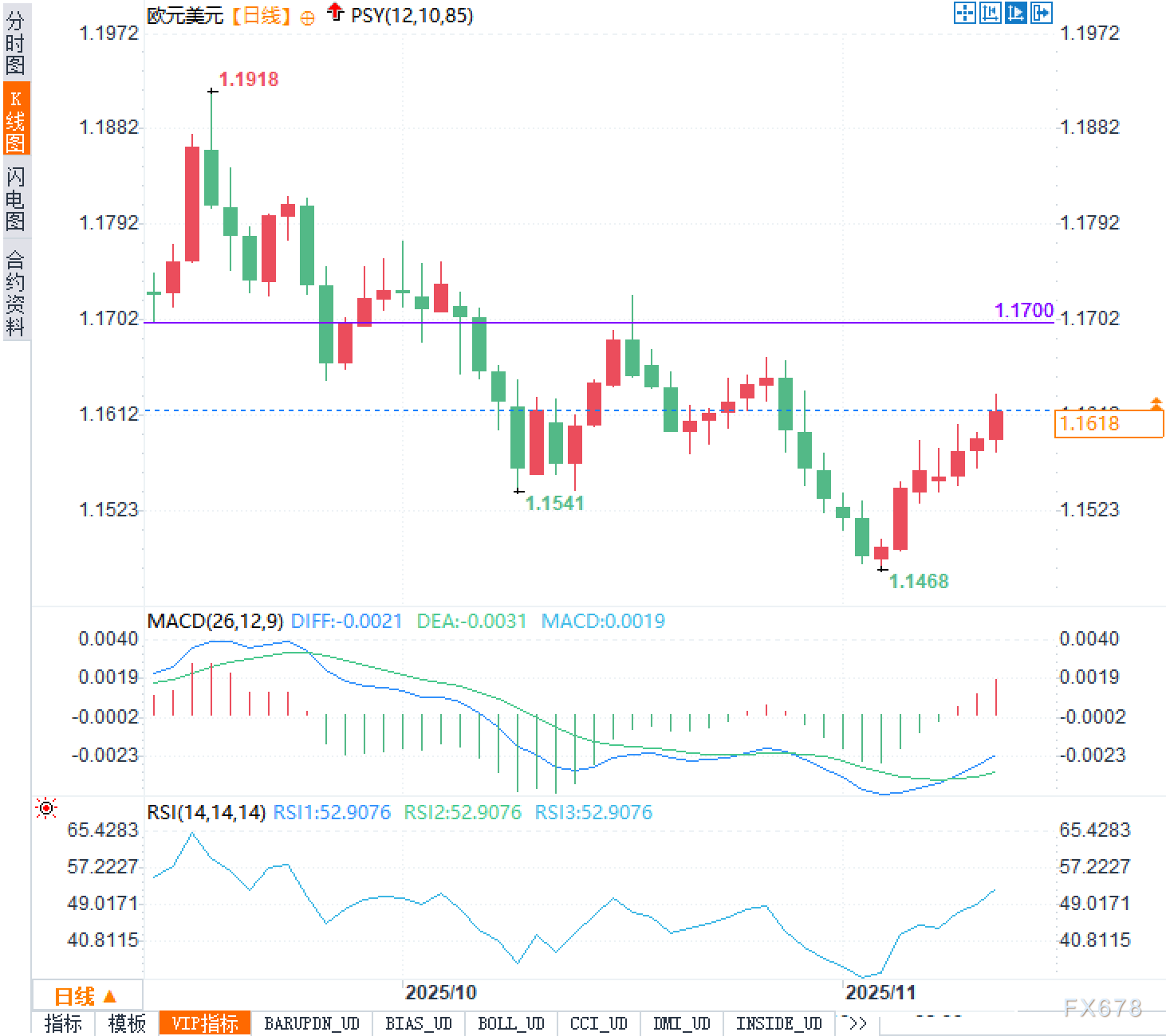 多头情景:若美国经济数据继续显示劳动力市场疲软,而通胀数据维持温和态势,市场对美联储12月降息的预期可能重新升温,这将压制美元并为欧元兑美元提供上行动力。技术面上,若汇价能够放量突破1.1700关键阻力位并站稳其上,将打开上行空间,目标指向1.1790区域,进一步可挑战1.1918前高。MACD金叉的形成以及RSI向上突破60水平将确认多头趋势的确立。多头展望的关键在于美联储政策预期的再度转向以及欧元区经济数据的边际改善。