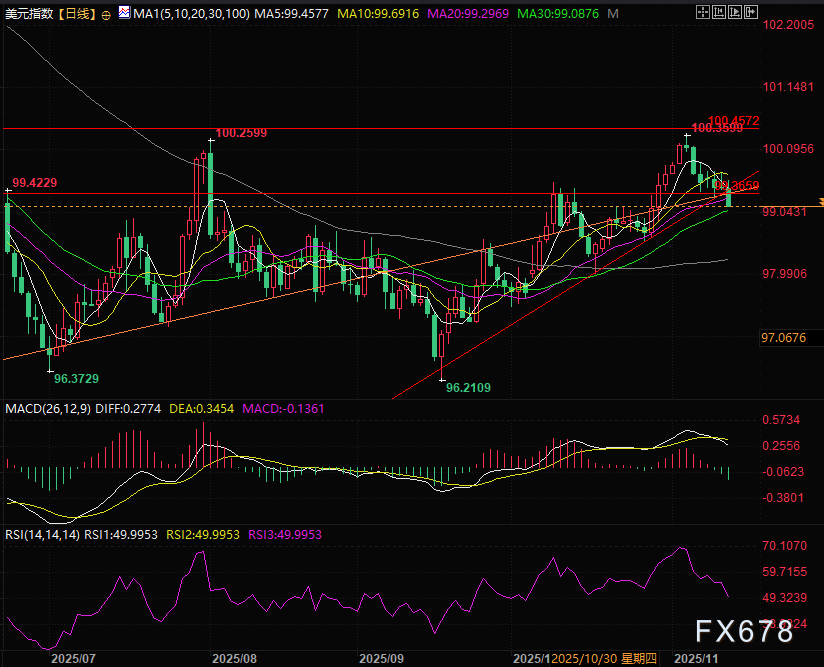汇通财经APP讯——周四(11月13日)亚欧交易时段,美元指数超预期震荡走低,交投于99.18附近跌破了前期上升通道等多数支撑。美国总统唐纳德·特朗普签署政府拨款法案、终结创纪录43天政府停摆。